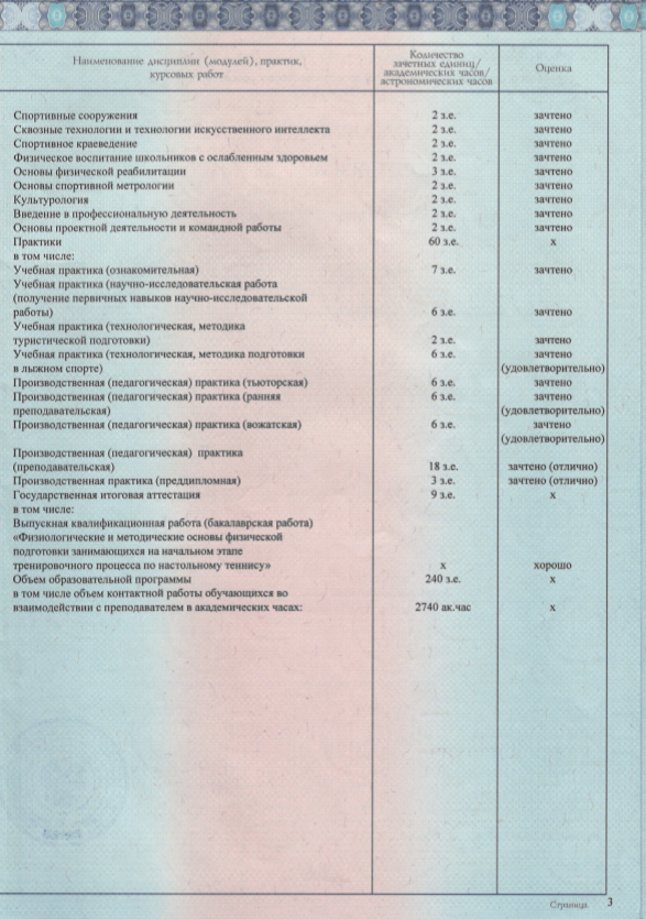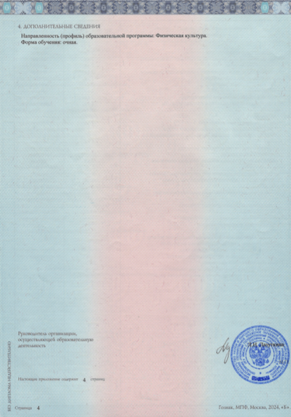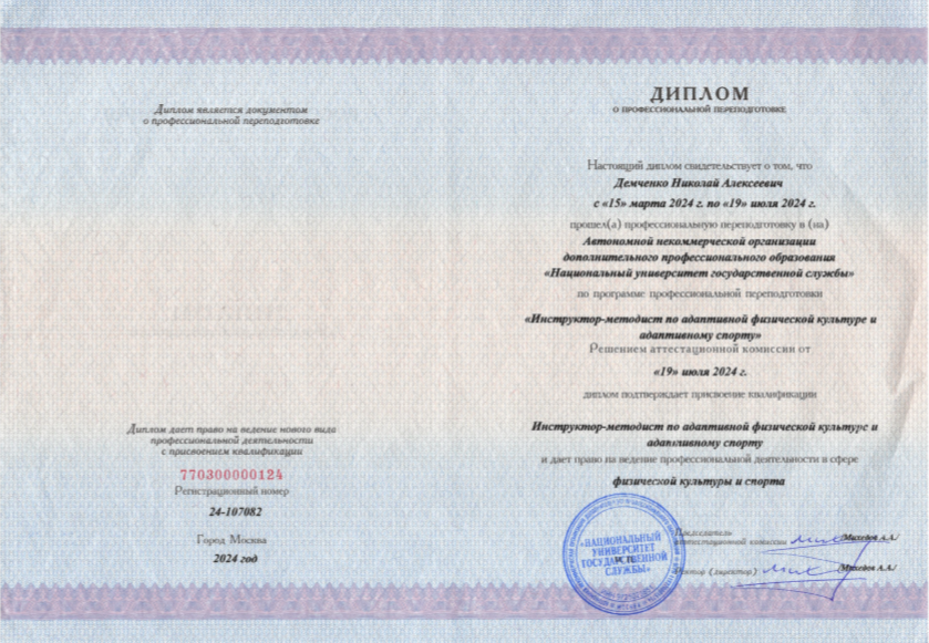 - Диплом о профессиональной переподготовке по программе «Инструктор-методист по адаптивной физической культуре и адаптивному спорту», Национальный университет государственной службы.