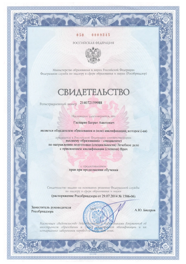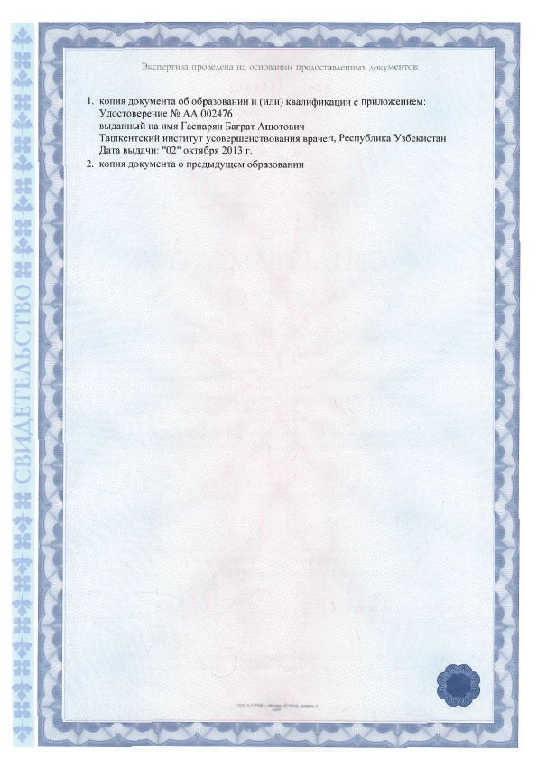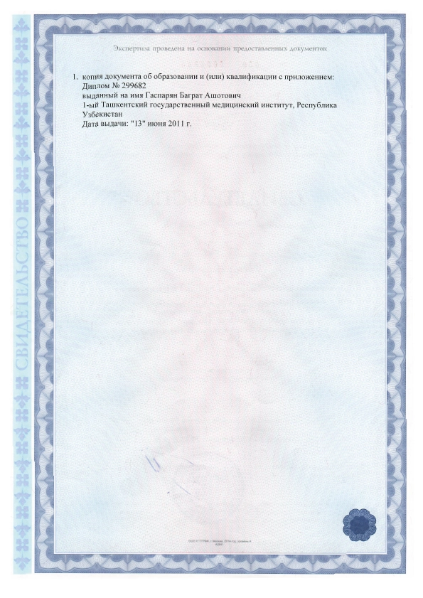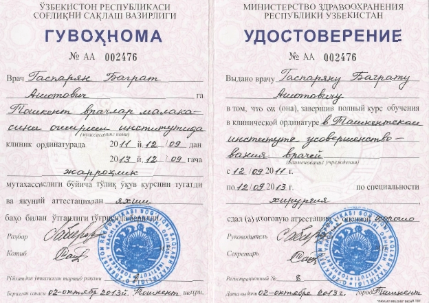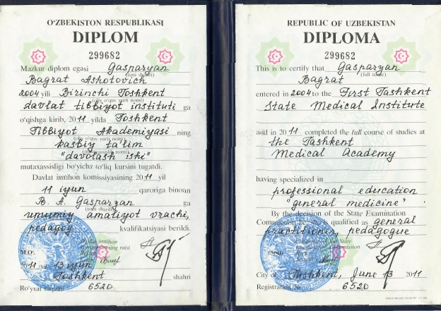 - Диплом по специальности «Лечебное дело», Ташкентская медицинская академия.