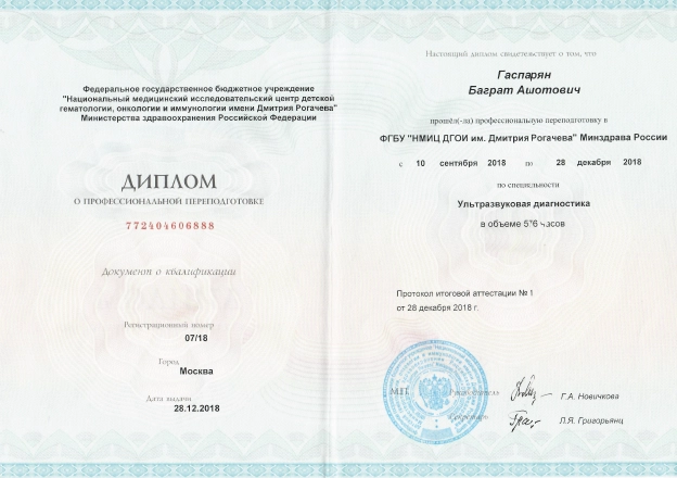 - Интернатура по специальности «Хирургия», НИИ Скорой помощи им. Н.В. Склифосовского.