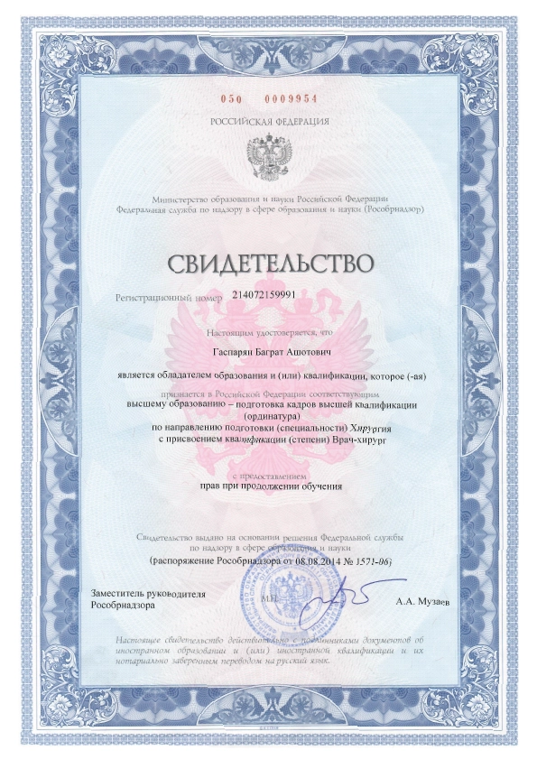 - Аспирантура по специальности «Хирургия», НИИ скорой помощи им. Н.В. Склифосовского.