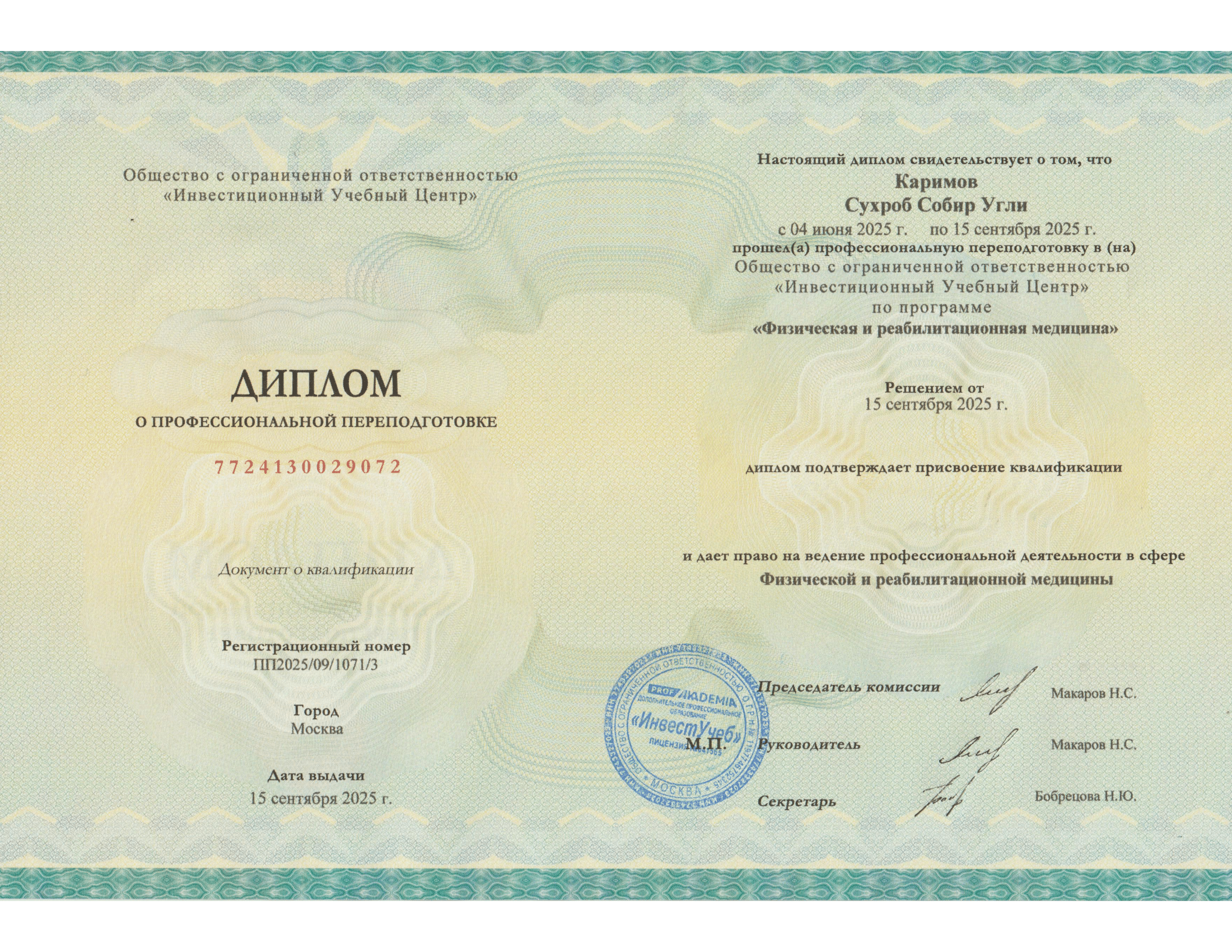 - Диплом о профессиональной переподготовке по программе «Физическая и реабилитационная медицина».