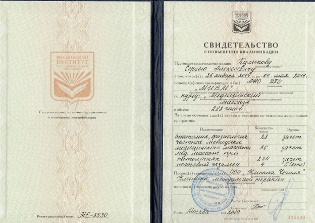 - Сертификат специалиста «Медицинский массаж», Московский институт восстановительной медицины.