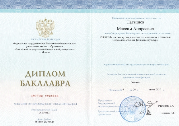 - Диплом бакалавра «Физическая культура для лиц с отклонениями в состоянии здоровья (Адаптивная физическая культура)», Российский государственный социальный университет.