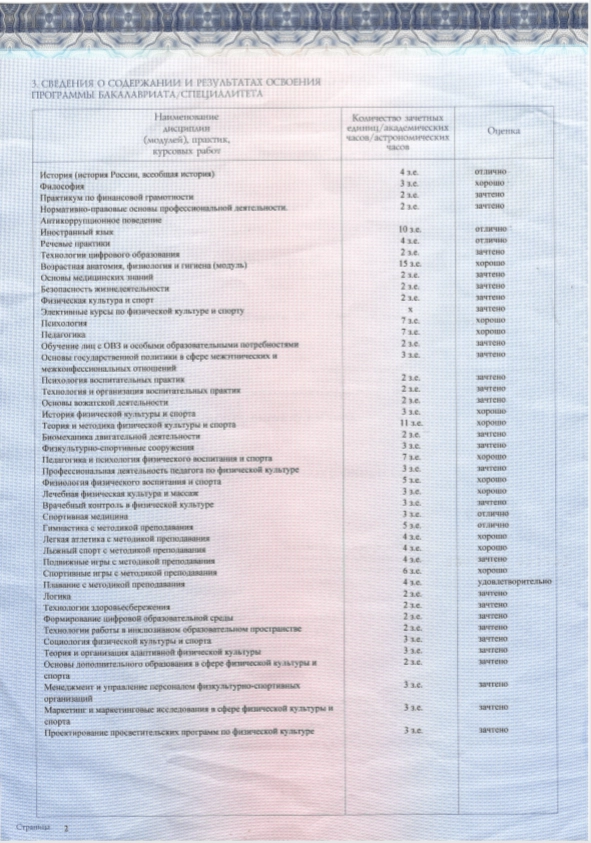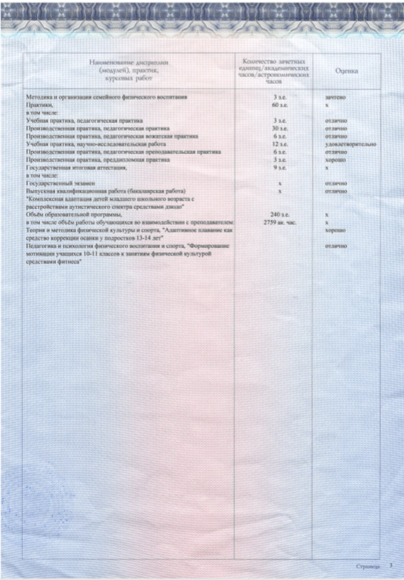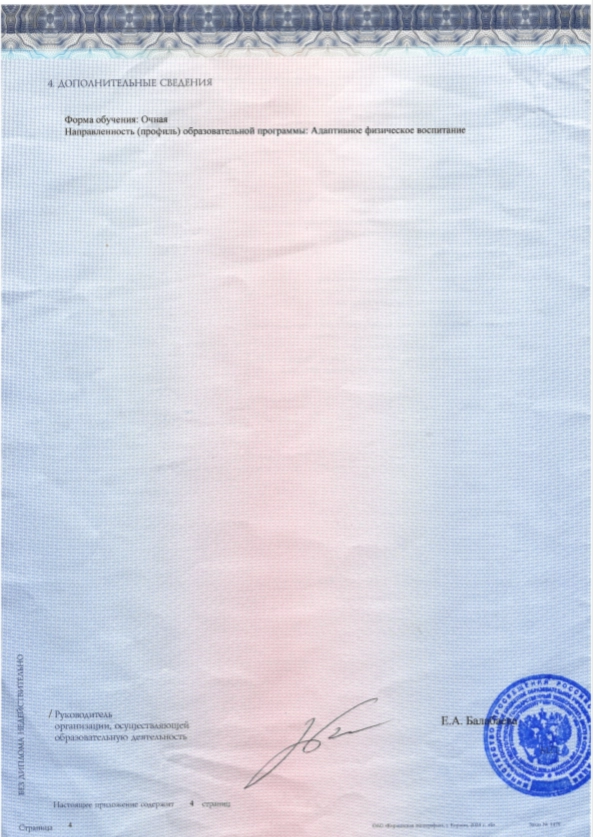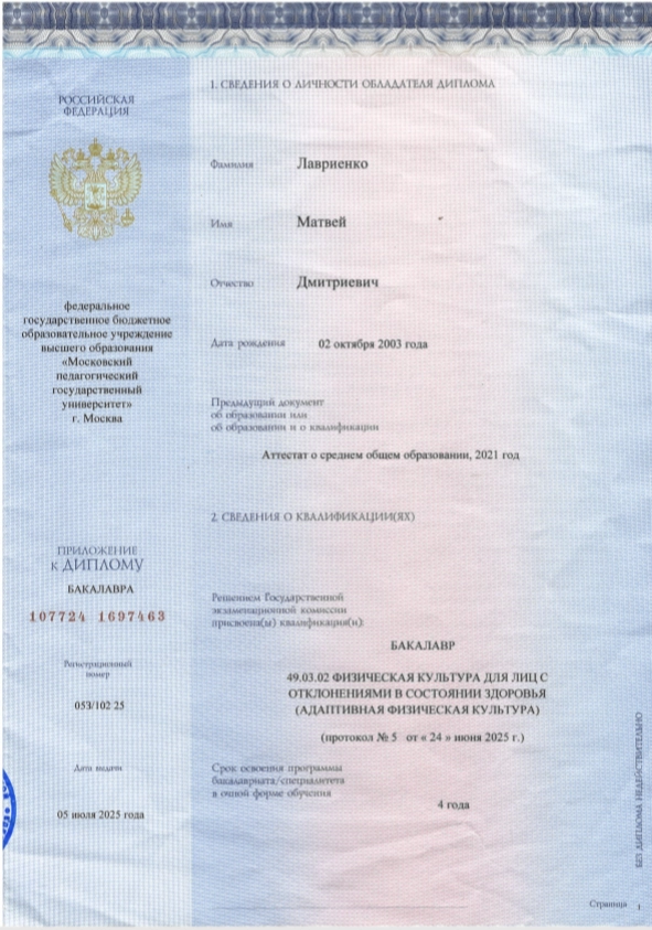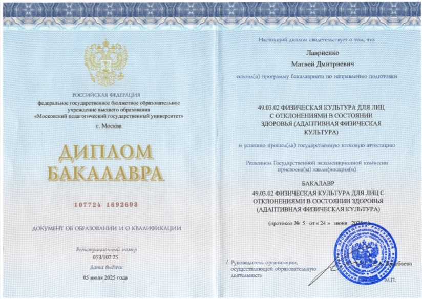 - Диплом бакалавра по направлению подготовки «Физическая культура для лиц с отклонениями в состоянии здоровья (адаптивная физическая культура)», Московский педагогический государственный университет, г. Москва.