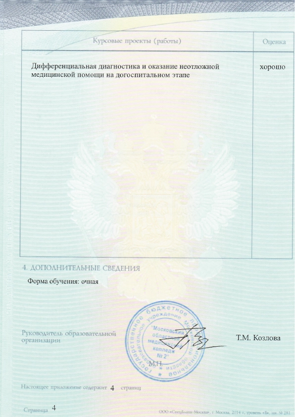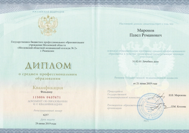 - Диплом о среднем профессиональном образовании по направлению «Лечебное дело», Московский областной медицинский колледж № 2.
