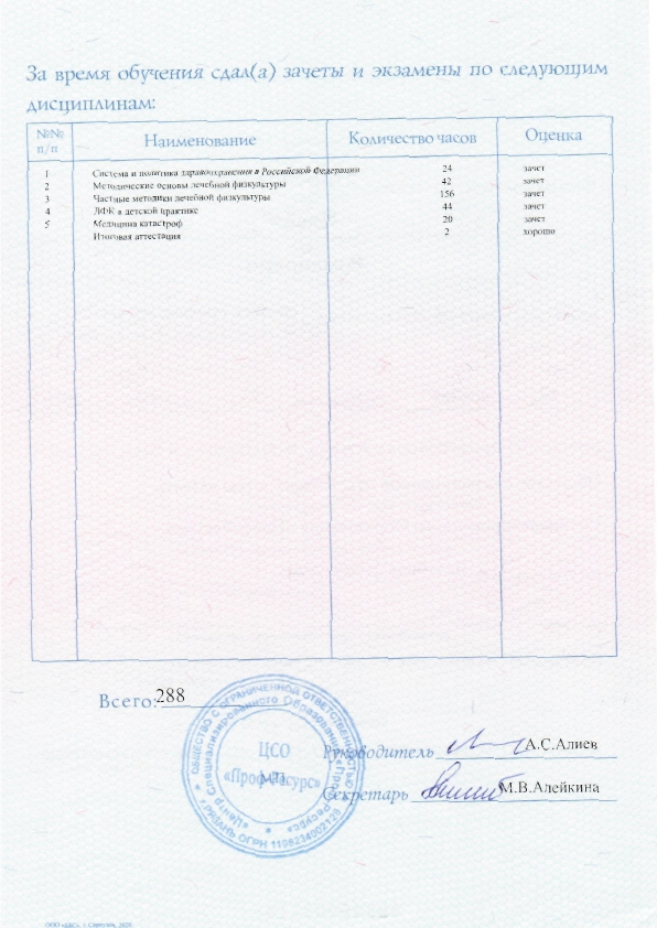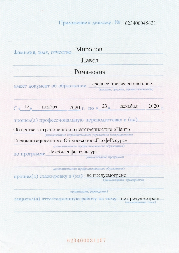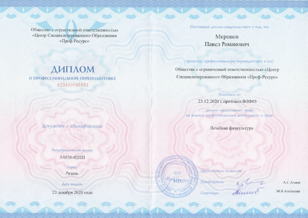 - Диплом о профессиональной переподготовке по программе «Лечебная физкультура», "Центр специализированного образования "Проф-ресурс"'.