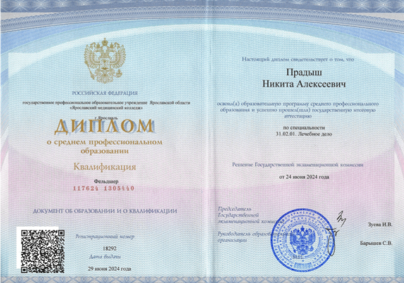- Диплом о среднем профессиональном образовании по специальности «Лечебное дело», Ярославский медицинский колледж.