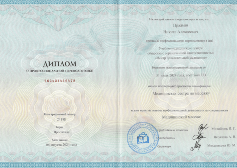 - Диплом о профессиональной переподготовке по специальности «Медицинская сестра по массажу», Центр доказательной медицины.
