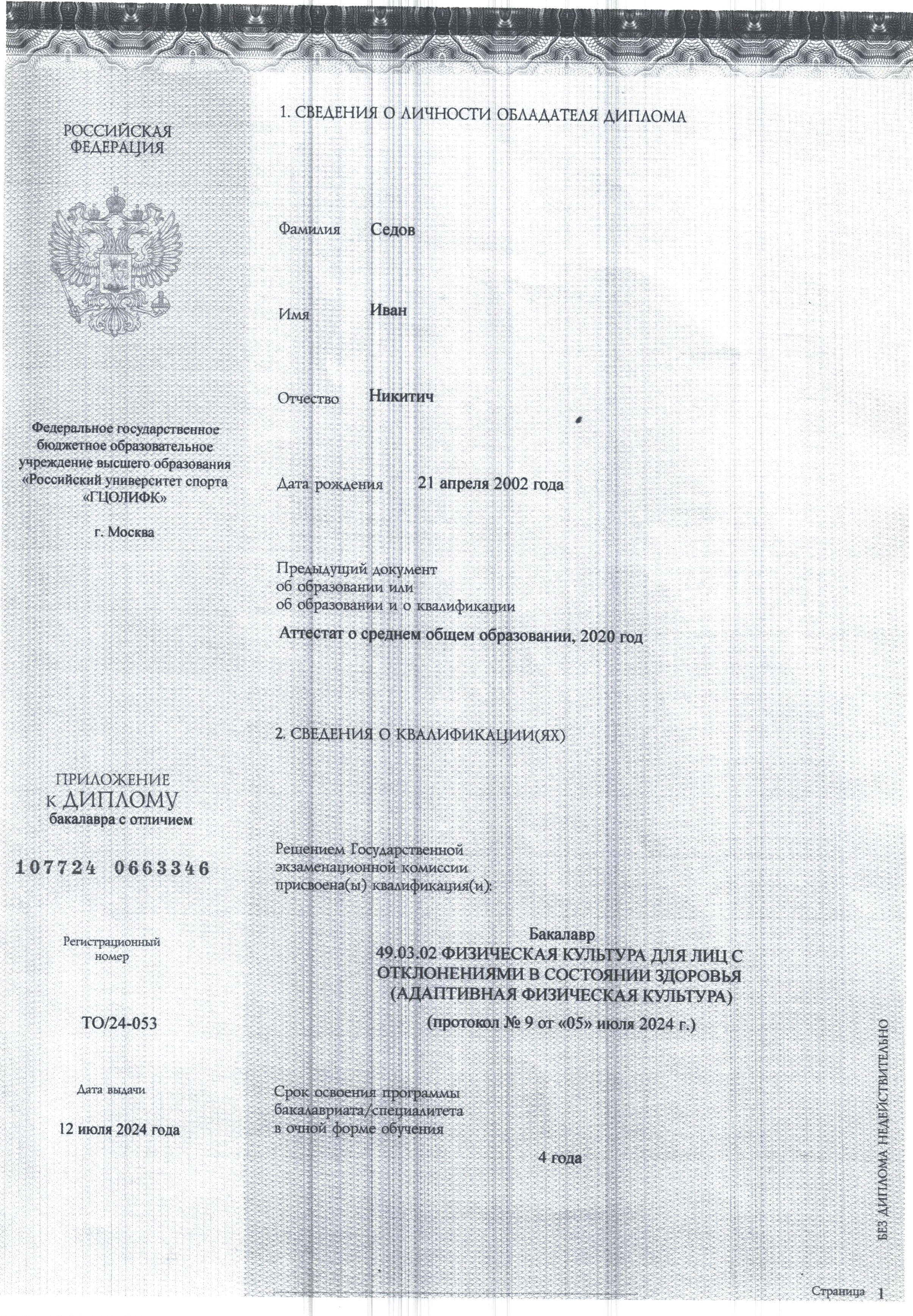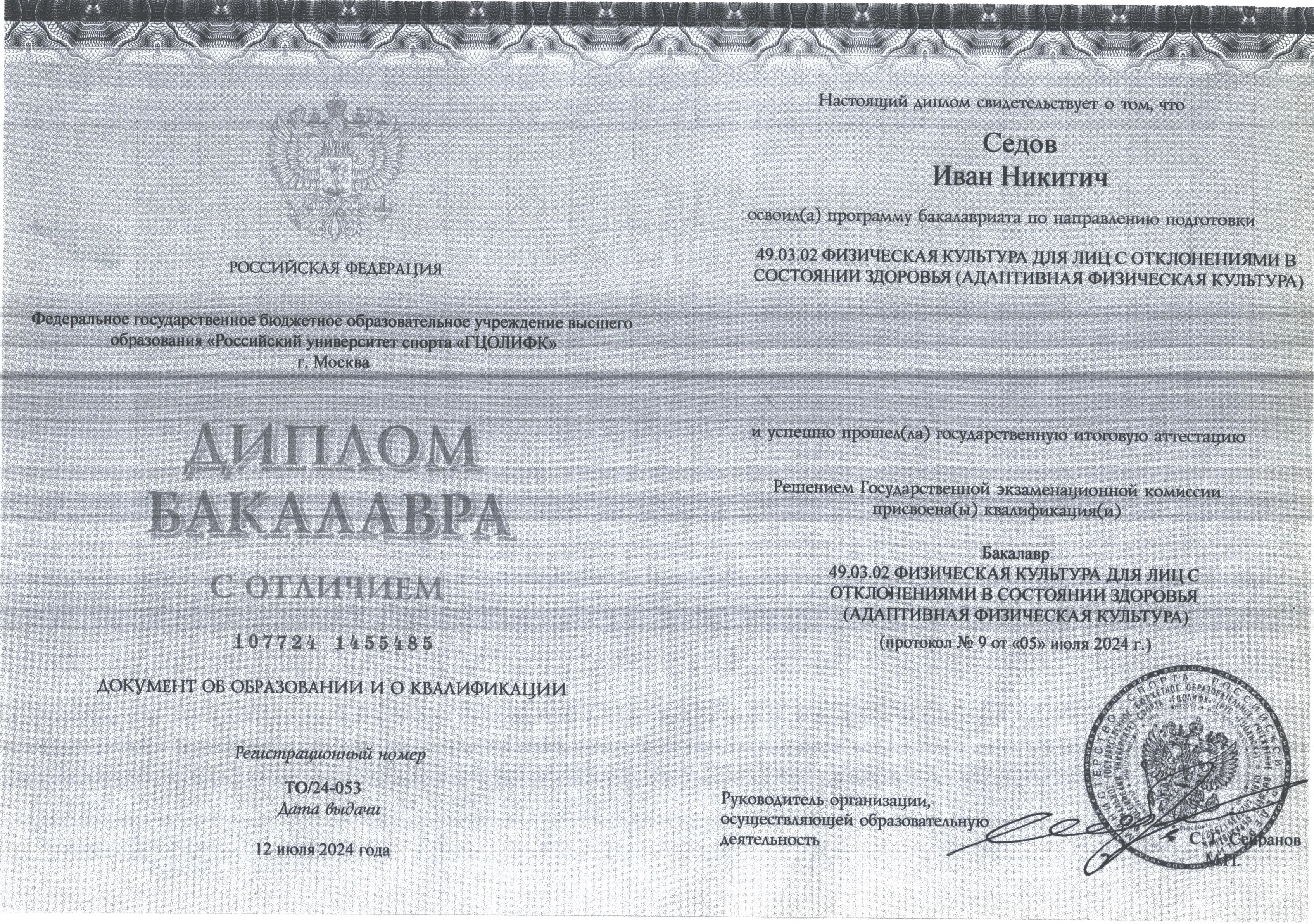 - Диплом бакалавра по направлению подготовки «Физическая культура для лиц с отклонениями в состоянии здоровья (адаптивная физическая культура)», Российский университет спорта «ГЦОЛИФК», г. Москва