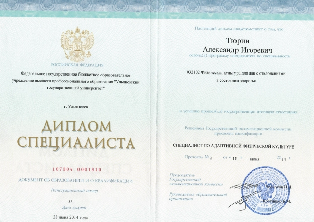 - Диплом специалиста по направлению «Физическая культура для лиц с отклонениями в состоянии здоровья», Ульяновский государственный университет.