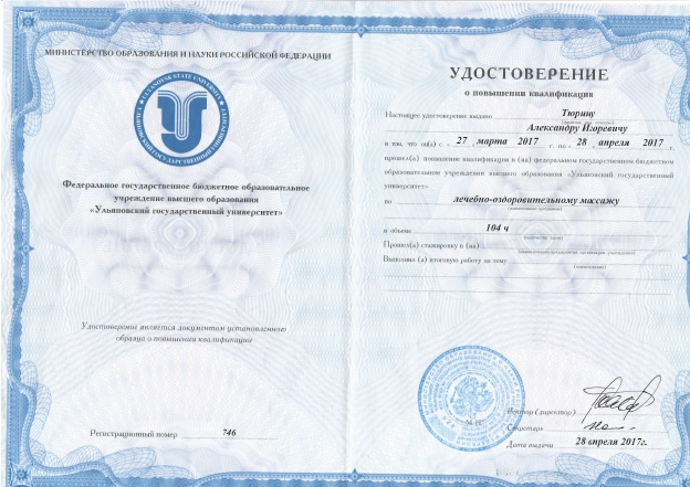 - Повышение квалификации по направлению «Лечебно-оздоровительный массаж», Ульяновский государственный университет.